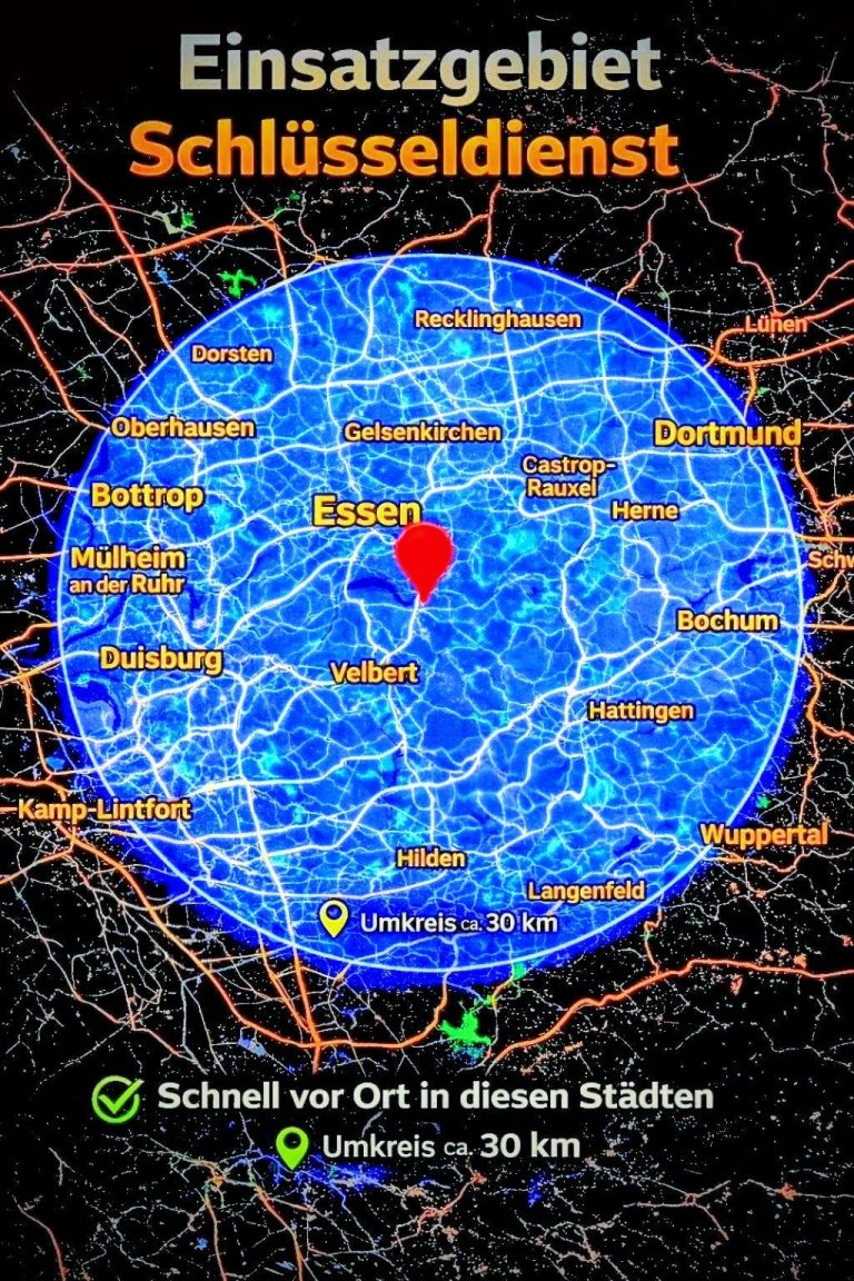 Durch unseren Standort in Essen erreichen wir viele Städte im Ruhrgebiet in kurzer Zeit. Einsätze in Bochum, Gelsenkirchen, Mülheim an der Ruhr oder Velbert erfolgen meist innerhalb von 15 bis 30 Minuten.